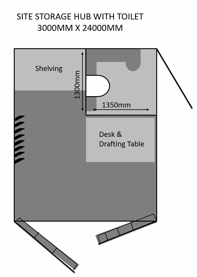 Site storage hub with fully self-contained toilet. The container style site hub has full double doors with storage pockets on the inside of both doors that are perfect for shovels, rakes and brooms, or the dumpy level and tripod etc. Inside is a desk with drafting table, 4 storage shelves and 8 hooks for ropes, chains, leads, etc. The toilet is in the style of a portable toilet, fully self-contained with a hand wash basin, fresh water tank and high capacity waste storage tank.